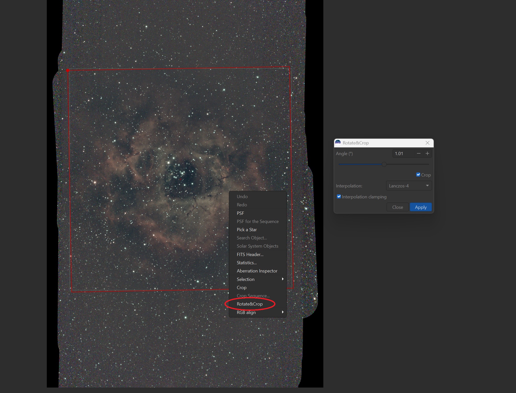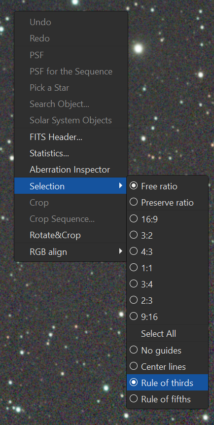 Nasze piękne i nieskalane dzieło sztuki musimy przyciąć tak by zminimalizować ilość artefaktów oraz szumu który czai się w rogach. Osobiście polecam włączenie reguły złotego trójpodziału (oraz opcjonalnie wybranie proporcji) i postępowania tak jak w przypadku kadrowania klasycznej fotografii, jednakże z priorytetem obcięcia artefaktów / większego szumu. Tj. Według mnie w astrofotografii ważniejsza jest czystość i jakość detalu niż kompozycja sama w sobie - najlepiej mieć jedno i drugie, ale, jak to mawia stare Chińskie przysłowie: "Z tragicznego materiału to i Maciek nie wyrzeźbi".