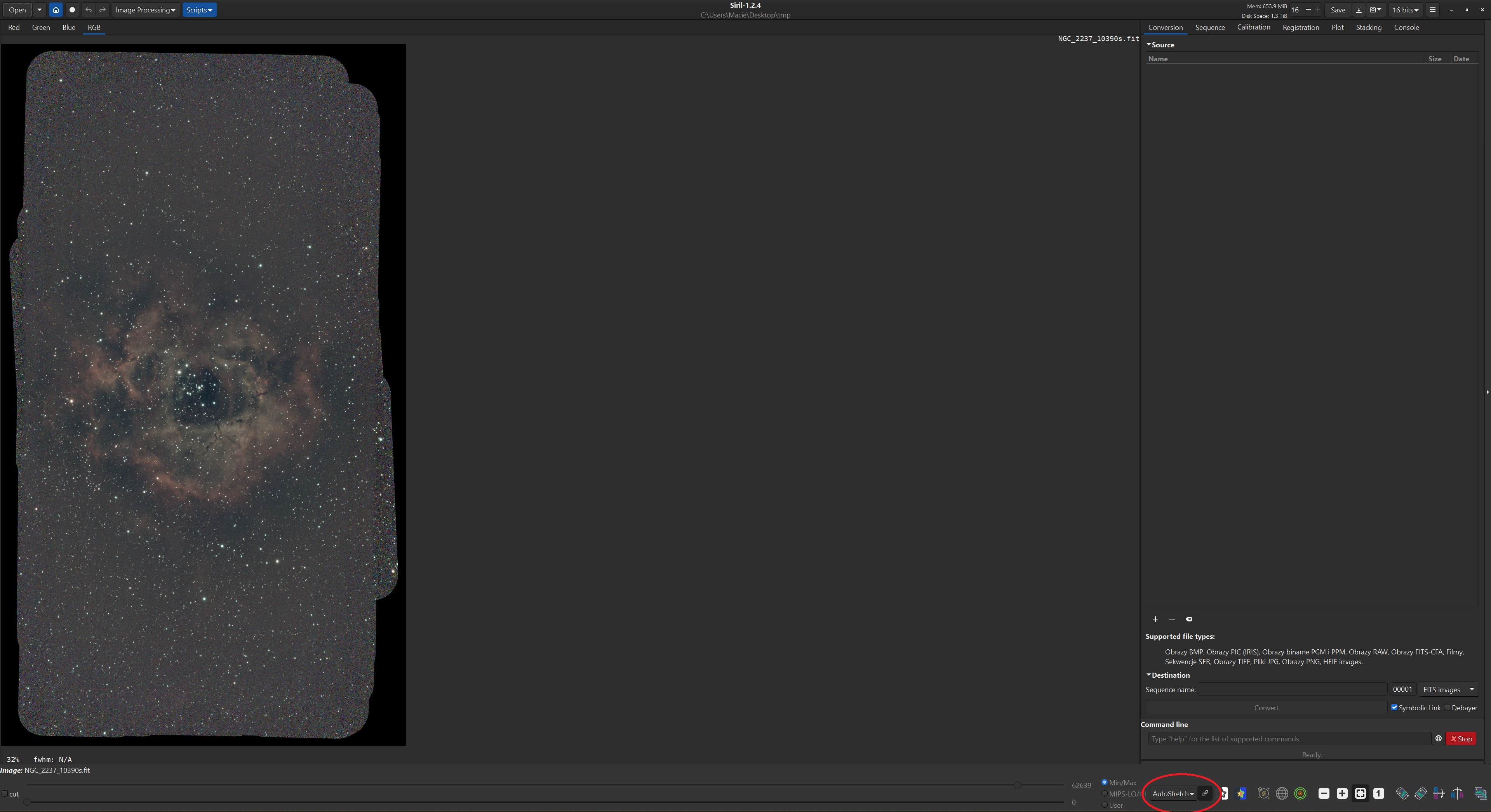 Na sam koniec warto posłużyć się podglądem w trybie rozciągnięcia histogramu w celu oceny czy szum jest w miarę równomierny. W tym celu wybieramy "Histogram" zamiast "Autostretch" i patrzymy po rogach gdzie w miarę naturalnie kończy się kasza a zaczyna jakikolwiek detal. Naturalnie po weryfikacji wracamy do autostretcha ;)