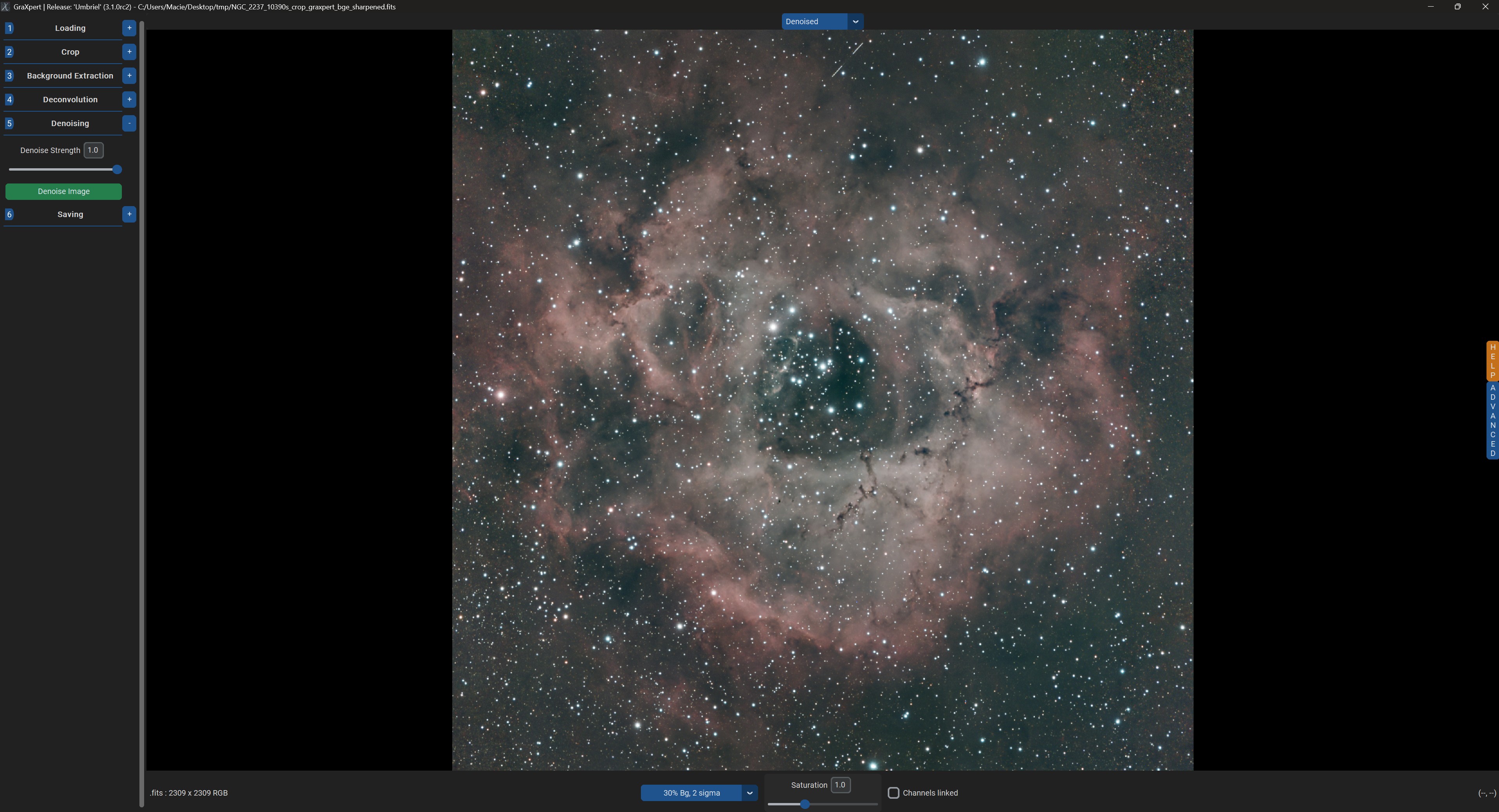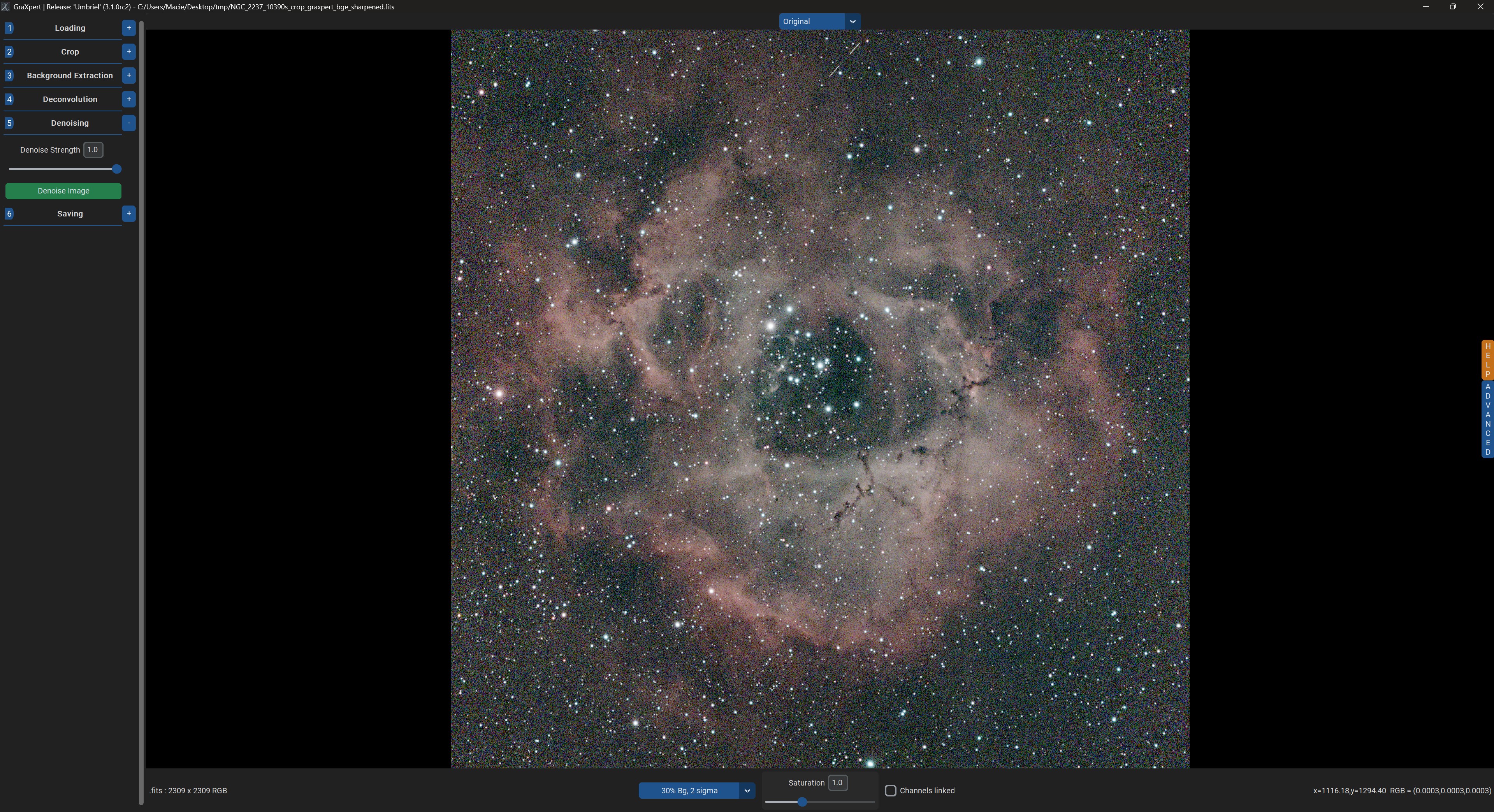 W przypadku zdjęć głębokiego nieba jak i w większości innych przypadków koniecznie należy ustawić siłę odszumiania na 1.0. Inne programy podchodzą różnie do tej kwestii, ale z moich obserwacji wynika, że GraXpert zawsze odszumia w ten sam sposób (niezależnie od użytej siły) i jedynie miesza oryginalne zdjęcie z wynikiem jeśli siła nie jest maksymalna. Dlatego w mojej opinii nie ma sensu sztucznie i z powrotem dokładać szumu skoro ten i tak już został usunięty! Ten przypadek jest jak ciąża, albo się w niej jest albo nie, trochę nielogicznie byłoby być tak trochę w ciąży, tak samo nielogicznym byłoby tylko trochę odszumiać w GraXpercie! ;)